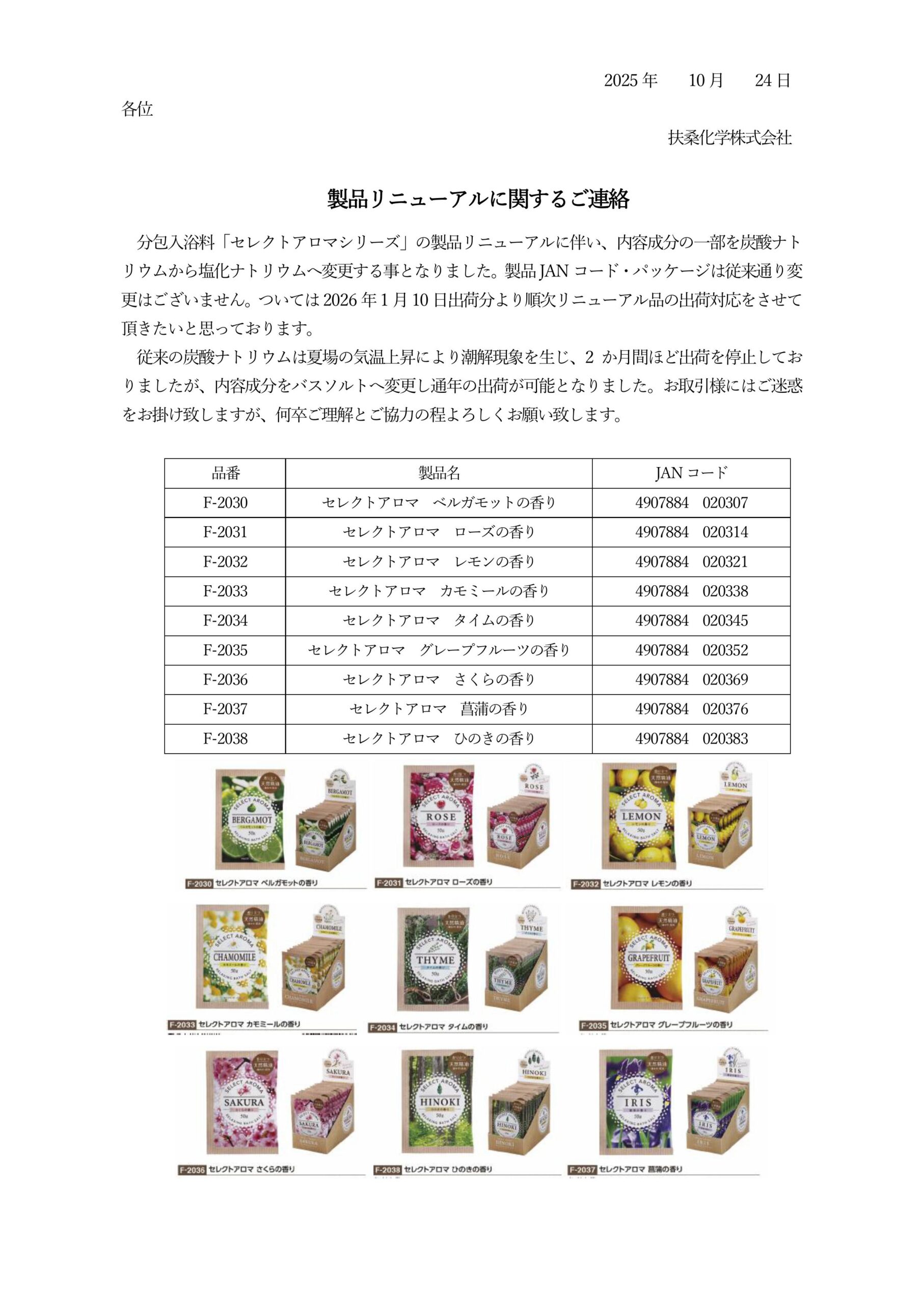 2026年より浴用化粧料「セレクトアロマ」の成分を変更してバスソルトにリニューアル。通年販売いたします。